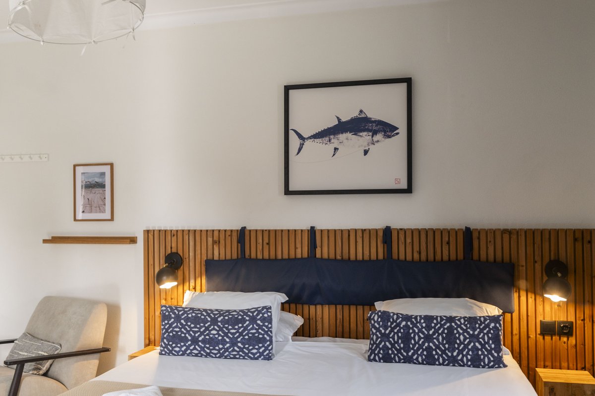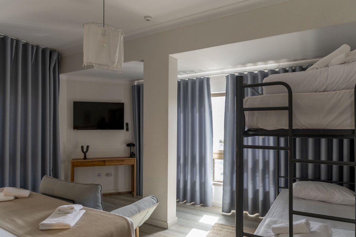 Quarto com capacidade para até 4 pessoas (cama de casal/duas camas individuais e um beliche), ideal para famílias e grupos de amigos. Todos os quartos estão equipados com televisão, ar condicionado e casa de banho privativa.